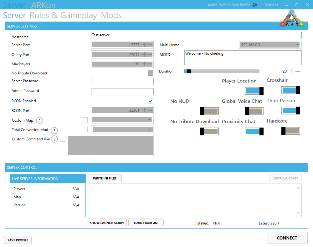 Ark remote is a tool which allows you to download and install mods and configure your server from a GUI interface application, the ARK Server Launcher.