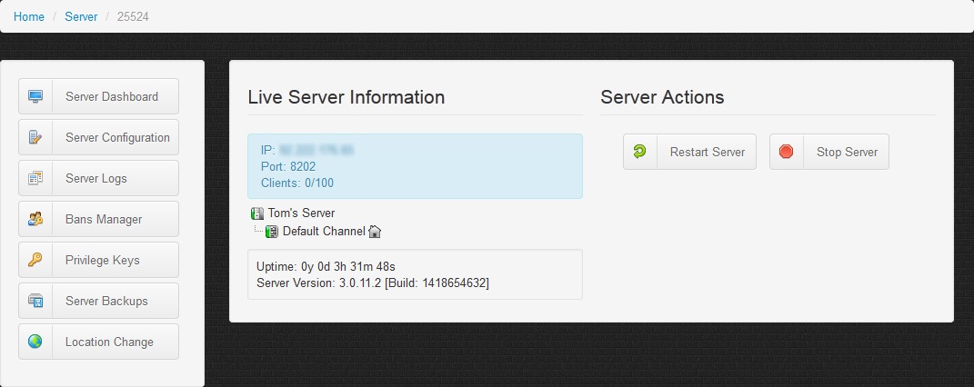 Your server's online users and channels are displayed along with important live information such as server uptime.